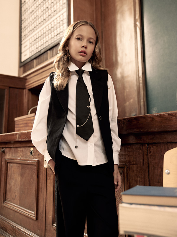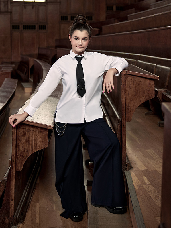 Блузка ALESSANDRO BORELLI для девочек – идеальное решение для школьных будней. Модель с длинным рукавом декорирована отложным воротником, манжетами на рукавах с вышивкой, застежкой на пуговицы, а также съемным галстуком с декорацией в виде цепи. Блуза свободного кроя будет идеально сочетаться как с брюками, так и с юбкой или сарафаном. Рубашка выполнена из качественной ткани с большим добавлением хлопка, что позволяет с комфортом посещать занятия или торжественные мероприятия. За ней не нужно постоянно ухаживать, после стирки ткань не теряет форму и цвет.