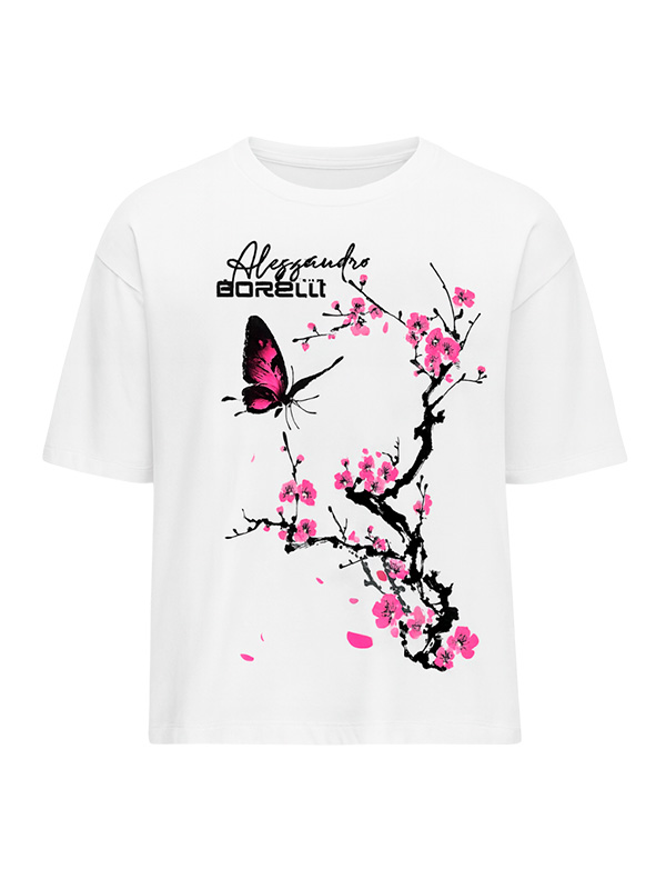Футболка для девочки Alessandro Borelli украшена изысканным принтом в японском стиле: черная ветка сакуры с ярко-розовыми цветами и бабочкой, символизирующей лёгкость и пробуждение. Свободный крой обеспечивает комфорт и современный силуэт. Модель выполнена из качественной хлопковой ткани, хорошо держит форму и не теряет цвет после стирки. Универсальный дизайн легко сочетается с джинсами, шортами и юбками, создавая модный и комфортный образ на каждый день.