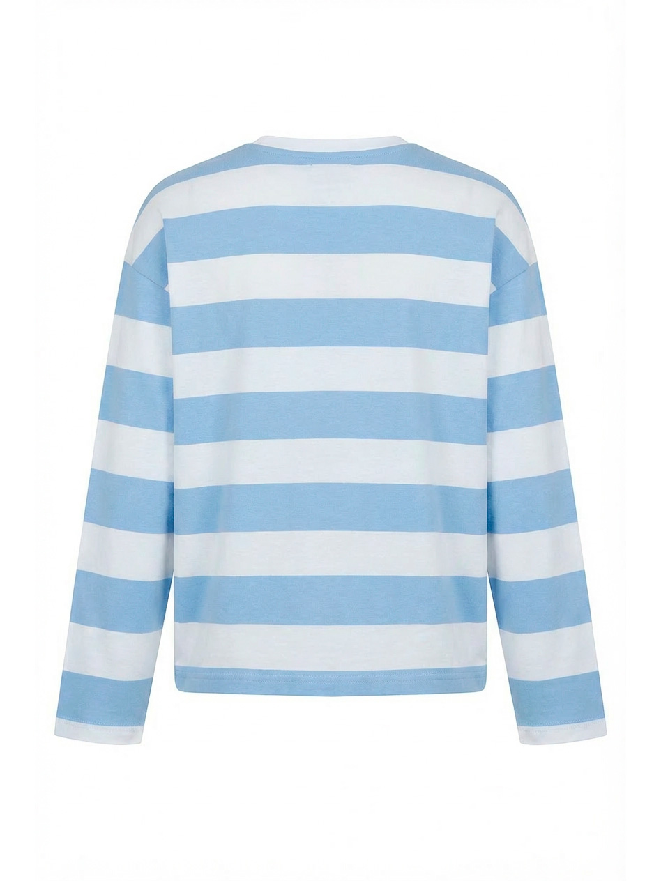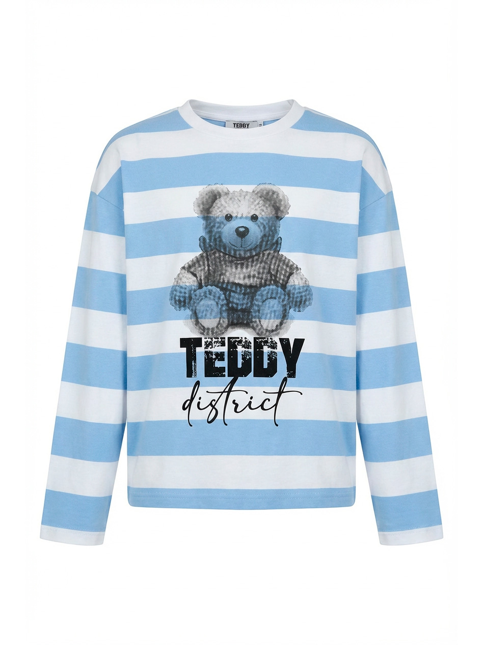 Лонгслив в полоску с мишкой для девочек. Стильный лонгслив в широкую голубо-белую полоску свободного кроя выполнен из мягкого хлопкового трикотажа с классическим круглым вырезом и длинными рукавами. Яркий принт с изображением плюшевого мишки в клетчатом свитере, выполненный в сине-серых тонах с эффектом растра. Под мишкой — надписи "TEDDY" черными буквами с текстурой и "district" элегантным курсивом. Универсальная модель для повседневной носки. Отлично сочетается с джинсами, юбками и леггинсами. Качественный материал обеспечивает комфорт и тепло.