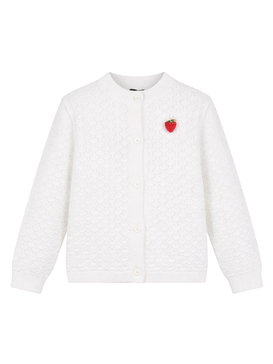 Белый ажурный кардиган с брошью для девочек. Нежный вязаный кардиган белого цвета с милым декором выполнен из мягкого трикотажа ажурной вязки с круглым вырезом, длинными рукавами и застежкой на пуговицы по всей длине. Воздушная вязка создает легкий романтичный образ. На груди слева — небольшая съемная брошь в виде красной клубники с зелеными листиками, добавляющая милый акцент. Универсальный кардиган для школы и повседневной носки. Отлично сочетается с платьями, юбками, брюками и джинсами. Ажурная вязка обеспечивает воздухопроницаемость. Нежный кардиган с милой деталью для девочек на весенне-летний сезон.