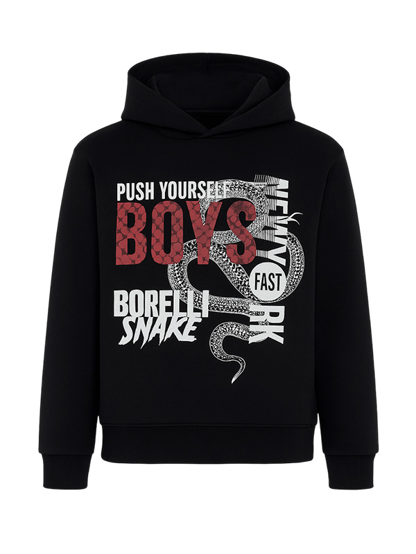 Худи для мальчика Alessandro Borelli — стильная и комфортная модель с выразительным графическим дизайном в спортивно-уличном стиле. Изготовлено из мягкого и плотной хлопковой ткани, которая обеспечивает комфорт и тепло в прохладную погоду. Фронтальная часть украшена крупным принтом с надписями Push Yourself, Boys, New York, Fast, Borelli Snake и изображением змеи, выполненной в контрастных оттенках красного, белого и серого. Такой дизайн подчёркивает дерзкий и динамичный характер модели.