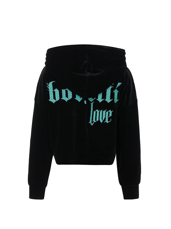 Худи ALESSANDRO BORELLI для девочек выполнено в черном цвете. Модель украшена глубоким капюшоном с контрастными белыми завязками, принтом в виде надписи «borelli love» на спине, а также карманом и манжетами на рукавах. Худи выполнено из качественной бархатной ткани, которая идеально подходит для осени или зимы. Стильный и смелый дизайн толстовки отлично подойдет для создания яркого повседневного образа.