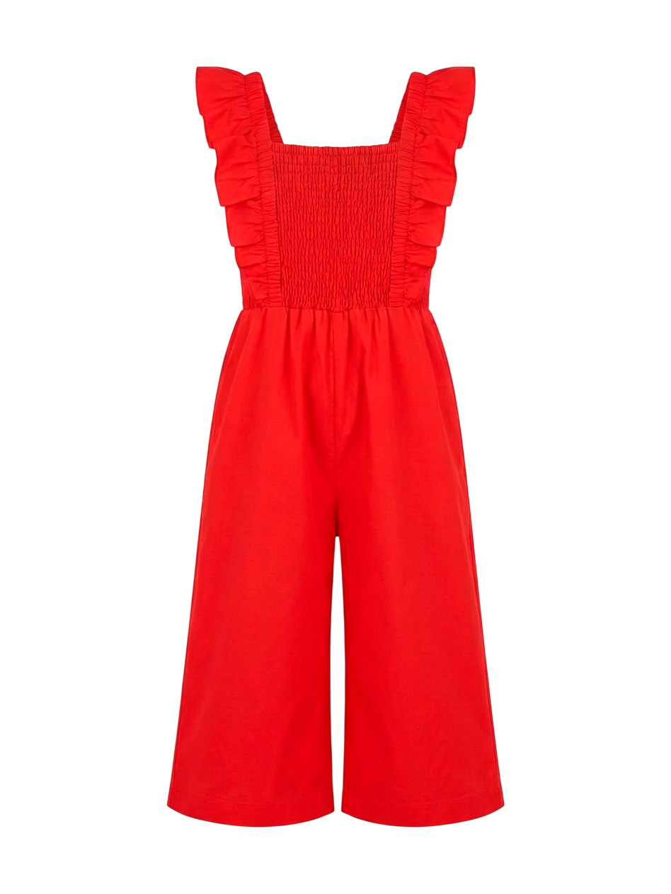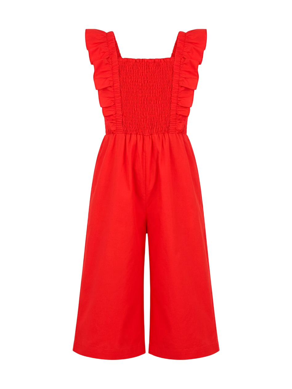 Красный летний комбинезон с рюшами для девочек. Яркий комбинезон насыщенного красного цвета выполнен из легкой ткани с квадратным вырезом и воздушными рюшами на бретелях. Эластичная присборенная резинка на лифе обеспечивает комфортную посадку и регулируемую ширину. Свободные укороченные брюки создают расслабленный летний силуэт. Эластичная резинка на талии для удобства. Стильная модель идеально подходит для жаркой погоды. Отлично сочетается с сандалиями и босоножками. Легкая ткань обеспечивает воздухопроницаемость.