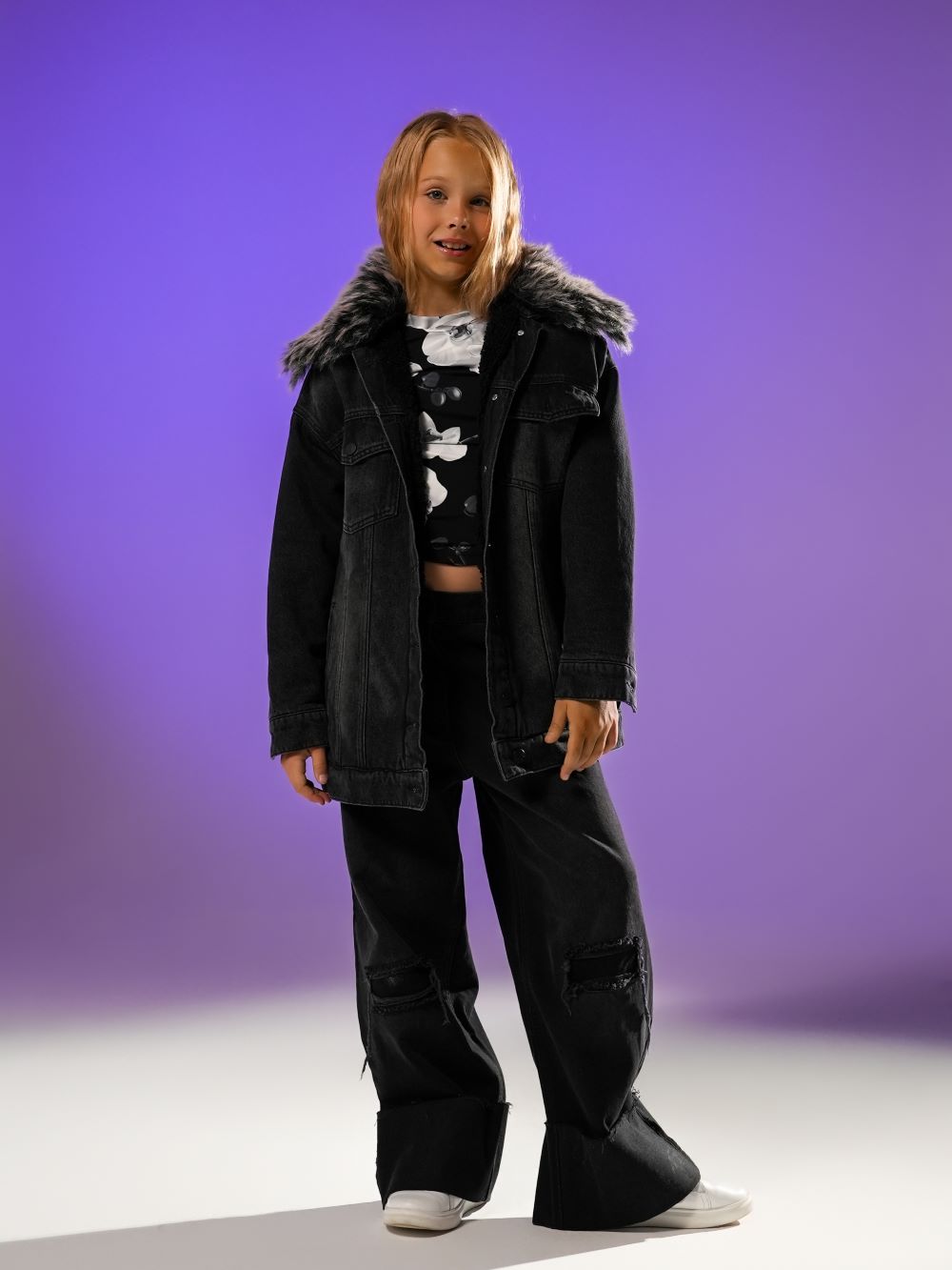 Джинсовая куртка ALESSANDRO BORELLI для девочек выполнена в черном цвете с эффектом выцветания, что придаёт ей стильный и современный вид. Модель застегивается на ряд крупных кнопок, имеет съемный меховой воротник, а также манжеты на рукавах. Спереди два нагрудных кармана на кнопках и два кармана без застежки по бокам. Внутри плотный утеплитель. Куртка выполнена из качественного хлопкового денима. За ней не нужен строгий уход, после стирки ткань не замнется и не потеряет цвет. Джинсовка выглядит модно и подходит для прохладной погоды.