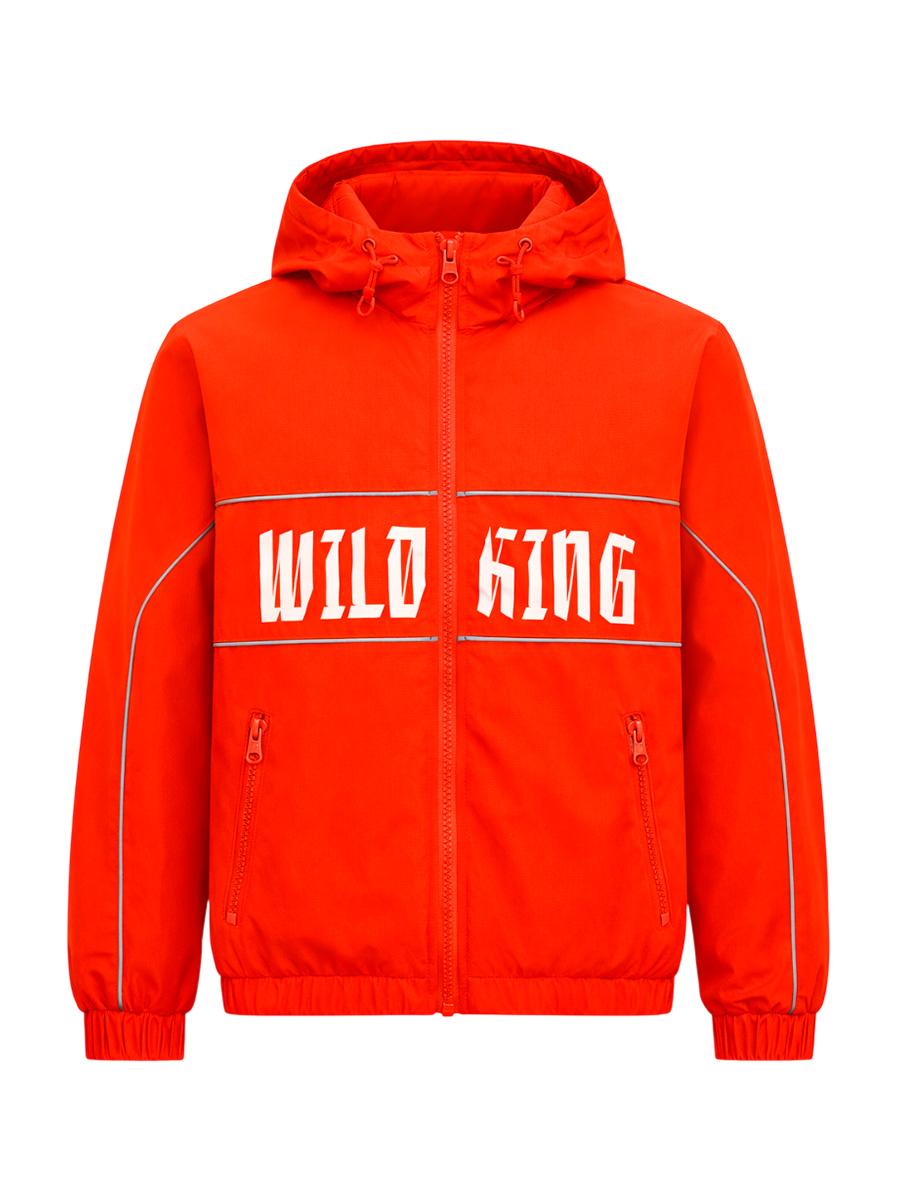 Оранжевая спортивная ветровка с капюшоном. Ветровка насыщенного оранжевого цвета выполнена из легкой ветрозащитной ткани с застежкой-молнией по всей длине, регулируемым капюшоном и эластичными манжетами. Эффектный дизайн с крупной белой надписью "WILD KING" на груди, обрамленной белыми светоотражающими полосами. Два боковых кармана на молнии для мелочей. Резинка по низу для защиты от ветра. Универсальная ветровка для весенне-осеннего сезона отлично сочетается с джинсами и спортивными брюками. Легкая ткань защищает от ветра.