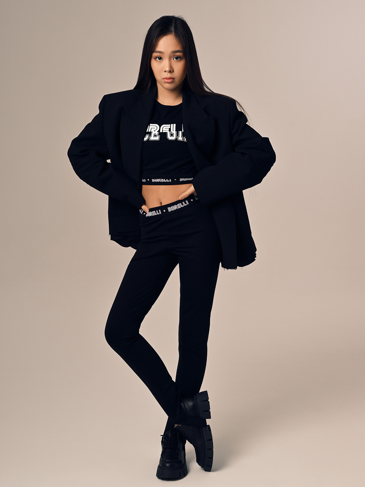 Леггинсы для девочки выполнены из эластичного, приятного на ощупь материала, обеспечивающего комфорт и свободу движений. Модель прилегающего кроя со штрипками, которые фиксируют брючины и не дают им задираться при активных движениях. Пояс на резинке с контрастным логотипом BORELLI и звёздочками добавляет стильный акцент и современный спортивный вид. Идеально подойдут для школы, спорта или повседневных образов — можно сочетать с худи, свитшотами и длинными рубашками. Практичный чёрный цвет делает модель универсальной и легко комбинируемой с любой одеждой.