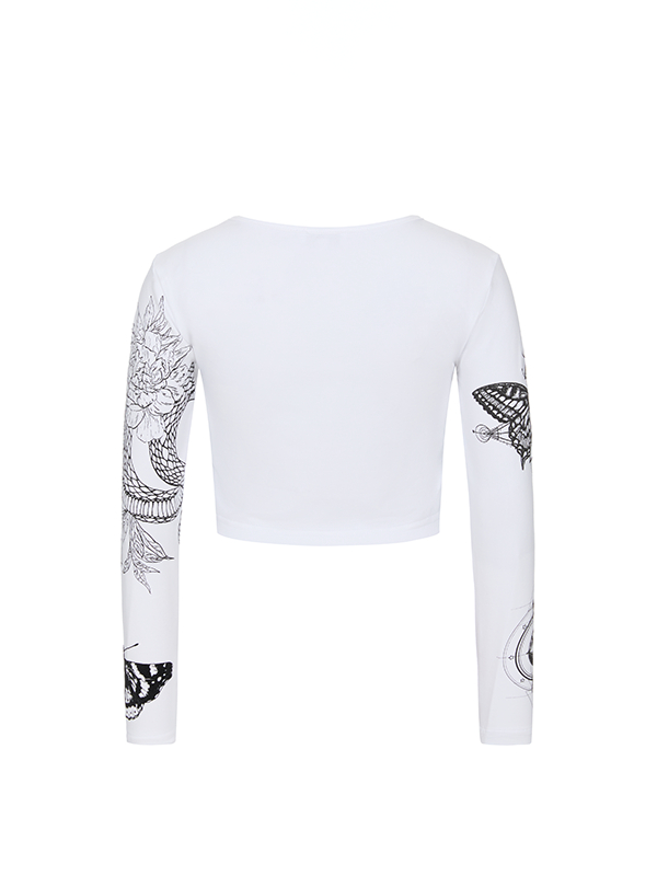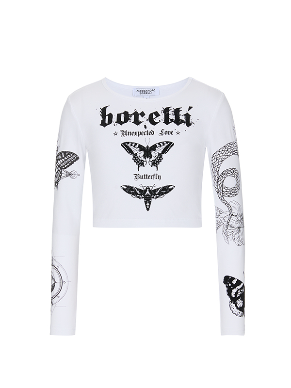 Лонгслив ALESSANDRO BORELLI для девочки идеально сочетается как с другими моделями из коллекции Snakes, так и с базовыми джинсами или шортами. Модель выполнена в белом цвете и украшена контрастными черными принтами. На передней части изображены крупные бабочки, а также надписи "borelli", "Unexpected Love" и "Butterfly". На рукавах также присутствуют рисунки в виде бабочек, змей и других декоративных элементов. Лонгслив имеет круглую горловину и длинные рукава, создавая стильный и современный вид. Строго ухода модель не требует: после стирки рисунок останется таким же ярким. В ней можно смело гулять, отдыхать или заниматься спортом.