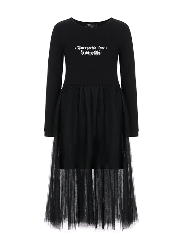 Платье ALESSANDRO BORELLI с длинными рукавами и округлым вырезом горловины выполнено в черном цвете. Модель сочетает в себе комфорт и оригинальность, в стиле коллекции Snakes. Верхняя часть украшена легким контрастным принтом на груди в виде надписи. Юбка выполнена из воздушного тюля, что придаёт наряду романтичность и легкость. Идеально подойдет как для повседневной носки, так и для особых случаев. Качественная ткань с большим добавлением хлопка не боится частых стирок и надолго сохраняет яркость рисунка.