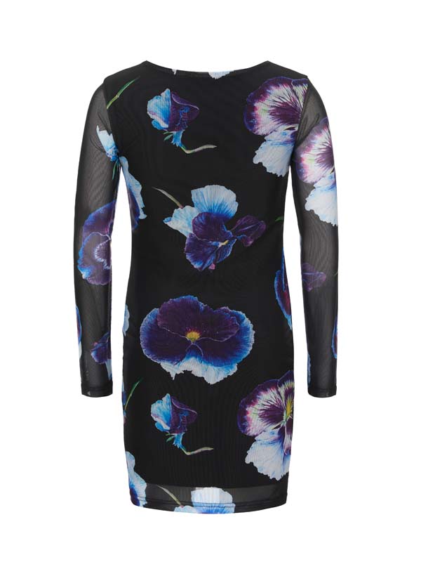 Платье ALESSANDRO BORELLI с длинным рукавом, длины миди из коллекции Violet выполнено из принтованной сетки с внутренней подкладкой. Основной цвет платья — черный, а его поверхность украшена ярким принтом крупных фиалок в оттенках синего, фиолетового и белого с желтыми акцентами в центре. Ткань не боится частых стирок и надолго сохранит яркость рисунка. Рукава выполнены из полупрозрачного материала, что придаёт наряду лёгкость и воздушность. Круглый вырез придает платью универсальность, оно подойдет для разных случаев — от вечернего выхода до стильного повседневного образа. Длина платья примерно до середины бедра, что подчеркивает его современный и женственный стиль.