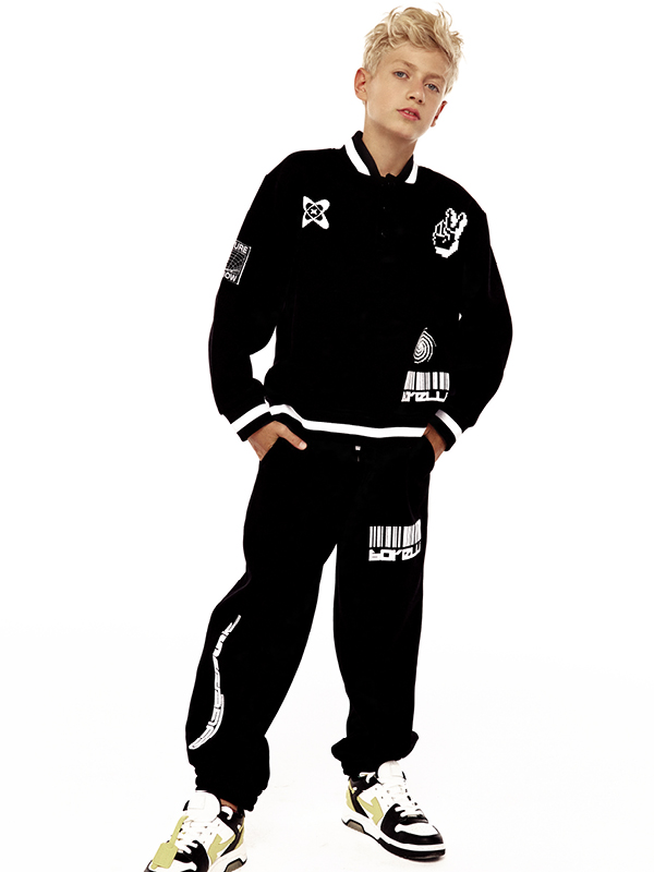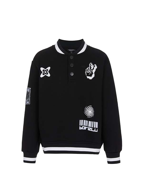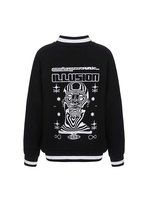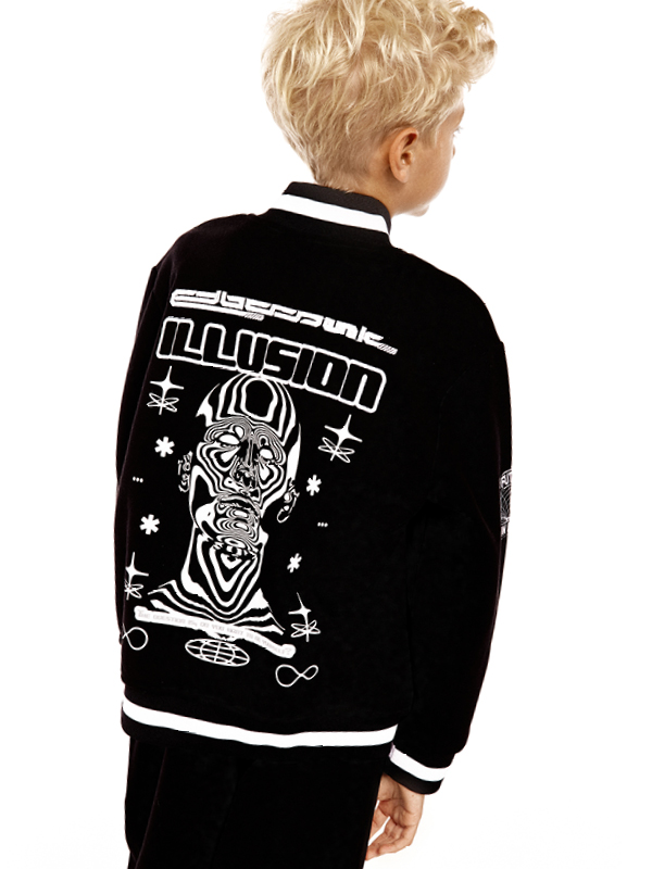 Свитшот ALESSANDRO BORELLI для мальчика выполнен в черном цвете из плотного материала с начесом. Он имеет округлый воротник, длинные рукава с манжетами и планку по низу изделия, окрашенные в контрастный белый цвет для создания стильного и современного образа. Застегивается на три кнопки спереди. На задней части изображён футуристический оптический узор с надписями "CYBERPUNK" и "ILLUSION". Он изготовлен из качественного материала с большим добавлением хлопка, поэтому в нем всегда будет комфортно. Свитшот не боится частых стирок: ткань не выцветает и не заламывается. Такой свитшот станет ярким акцентом в гардеробе.