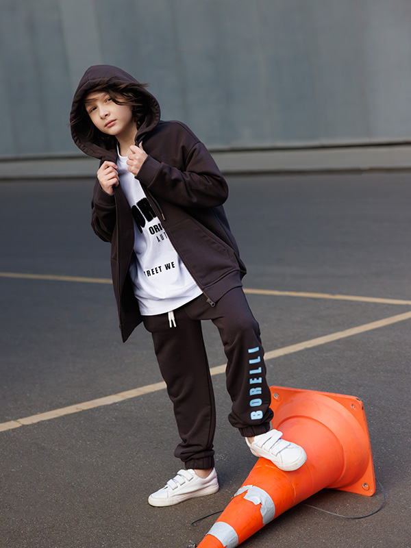 Толстовка для мальчика Alessandro Borelli — стильная и практичная модель, идеально подходящая для повседневного гардероба. Изготовлена из качественной хлопковой ткани, которая обеспечивает комфорт и свободу движений. Модель имеет свободный крой с капюшоном и застёжкой на молнию, а также вместительные карманы-кенгуру. Декорирована контрастным принтом с надписью “Original Brand Alessandro Borelli” и крупными буквами АВ в голубом оттенке — современный акцент, добавляющий динамичности образу.