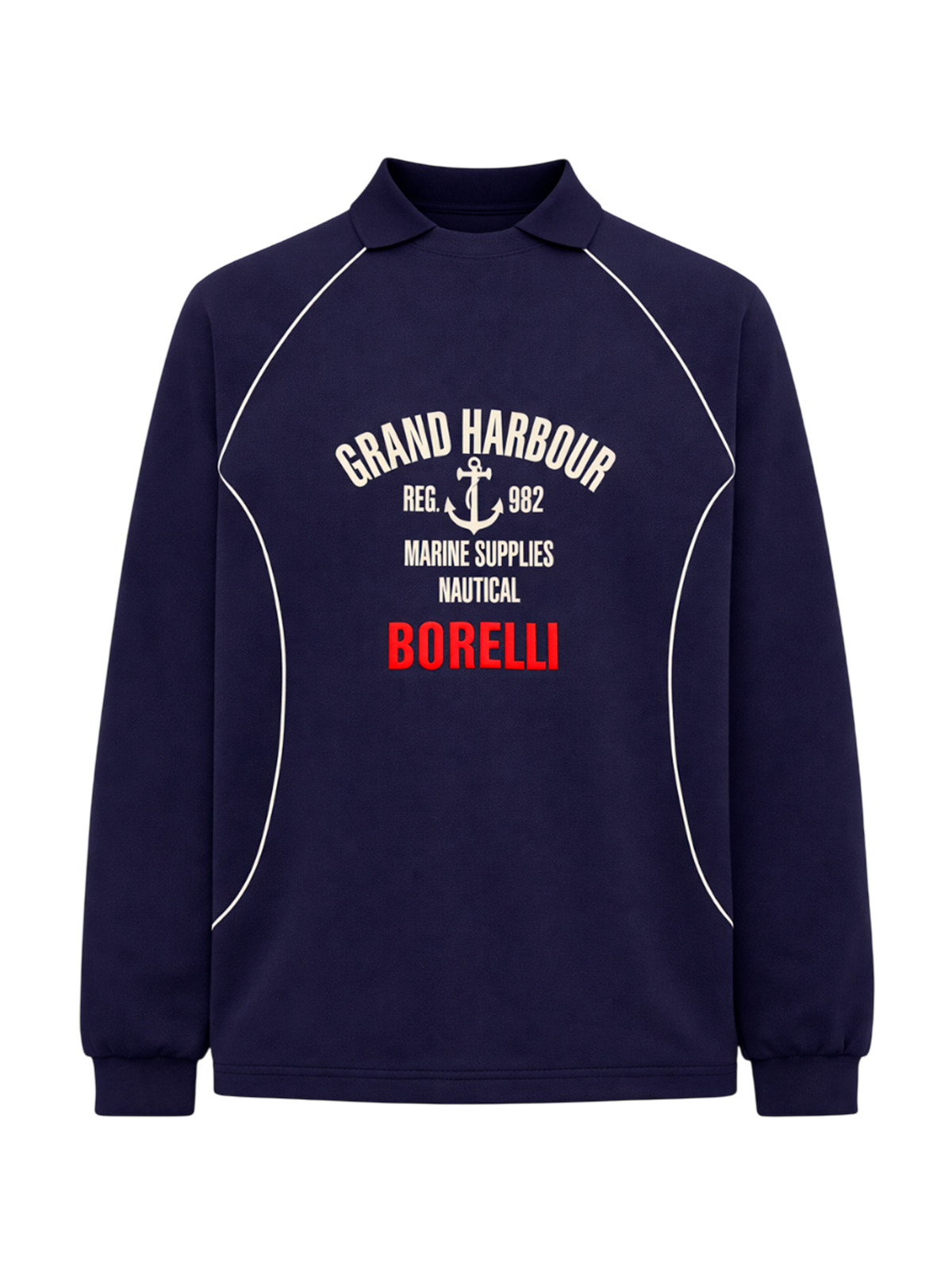Темно-синий свитшот-поло в морском стиле для мальчиков. Стильный свитшот-поло темно-синего цвета выполнен из плотного трикотажа с воротником поло, длинными рукавами покроя реглан, эластичными манжетами и резинкой по низу. Морская тематика с белым кантом по линии реглана и надписями: "GRAND HARBOUR", "REG. 982", "MARINE SUPPLIES", "NAUTICAL" и "BORELLI" красными буквами. Якорь между надписями добавляет морской характер. Универсальный свитшот отлично сочетается с джинсами и брюками. Плотный материал обеспечивает тепло и комфорт.