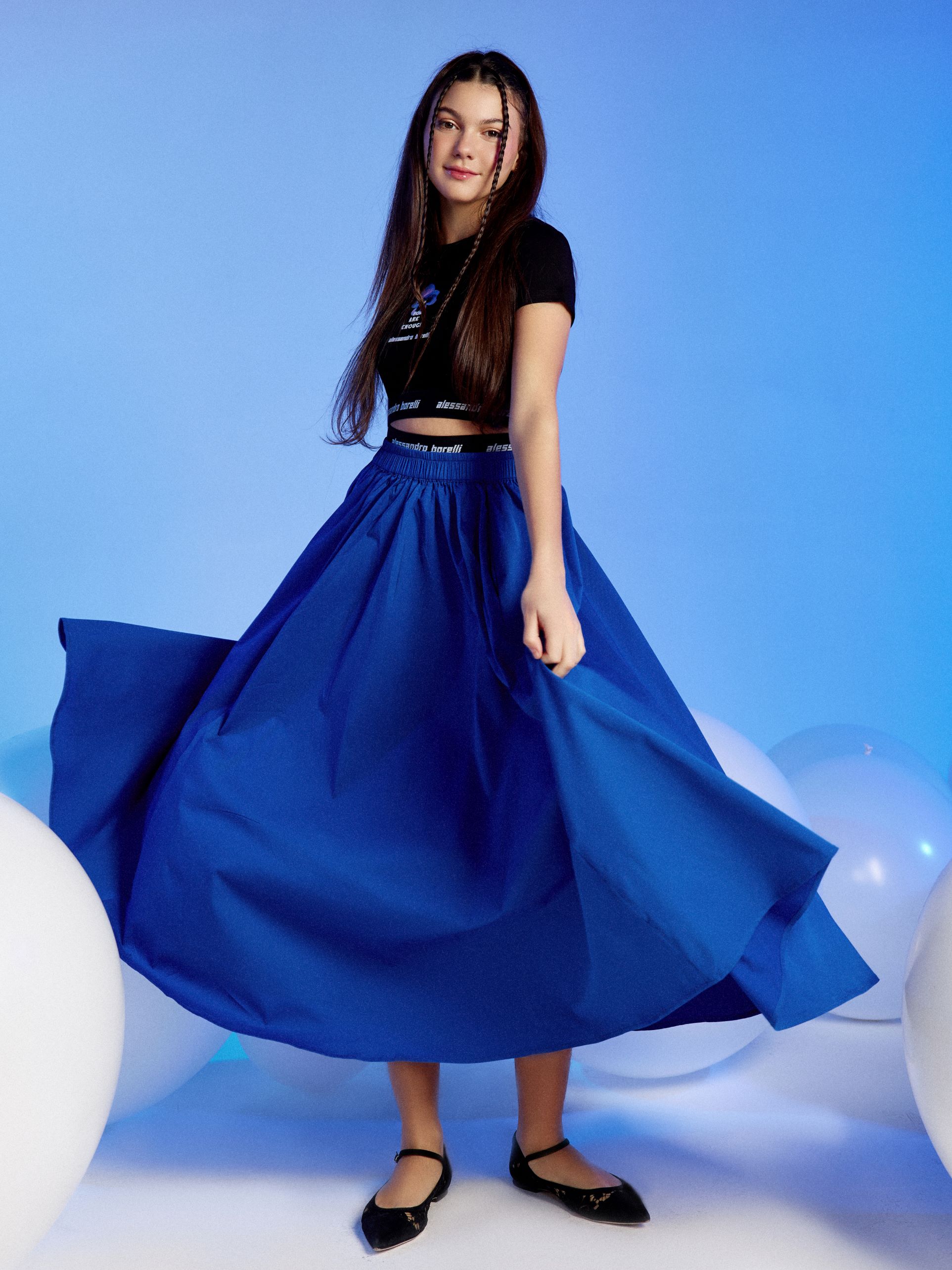 Юбка ALESSANDRO BORELLI для девочек выполнена в насыщенном синем цвете. Она имеет расклешённый фасон А-силуэта и изготовлена из лёгкой ткани, создающей мягкие складки. Верхняя часть юбки оснащена широкой эластичной резинкой чёрного цвета с белой надписью "alessandro borelli", что придаёт модели современный вид. Длина юбки — миди, это делает её универсальной для создания различных образов. Модель выполнена из качественной хлопковой ткани, благодаря этому за ней не нужен строгий уход. После стирки юбка не заминается и не теряет своей яркости. Юбка для девочки – идеальный вариант для лета и теплой весны. Высокое качество и стиль делают юбку лучшим выбором для долгих прогулок.